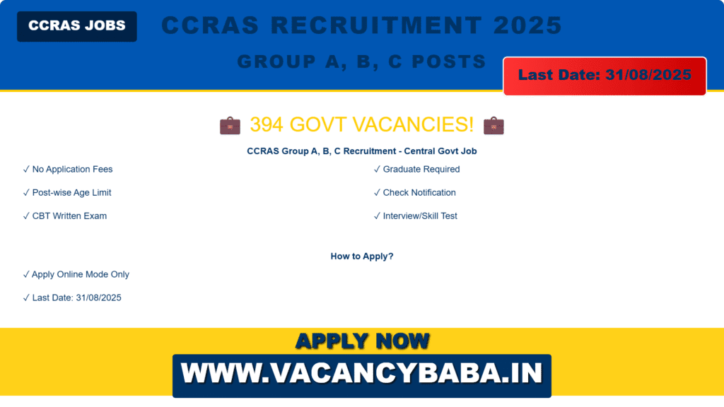Get Ready for Exciting Career Opportunities! The Central Council for Research in Ayurvedic Sciences (CCRAS) is set to announce its recruitment for various Group A, B, and C posts in 2025. This is your chance to secure a position in a prestigious organization dedicated to Ayurvedic research and development. Stay updated with all the essential information regarding CCRAS Recruitment 2025, including notifications, application processes, important dates, and more. For the latest updates, visit vacancybaba.in .